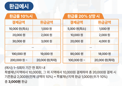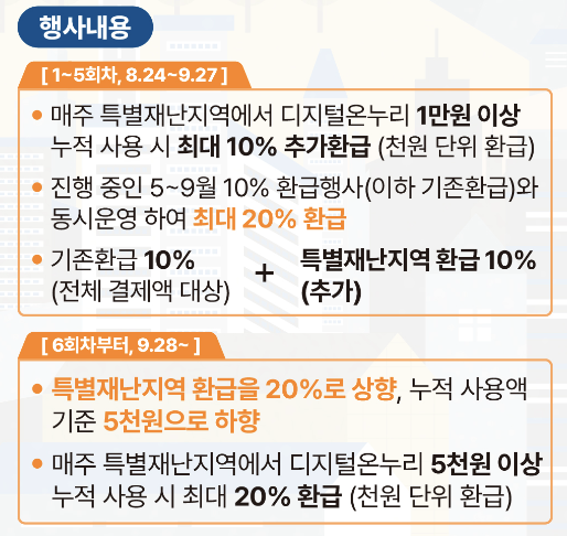 | 1~5회차 | 2025.08.24(일) ~ 2025.09.27(일) | 기존 10% 환급 + 추가 10% 환급 | 1만원 이상 | 기존 10% 환급행사와 더불어 특별재난지역 환급 10% 추가 적용 |