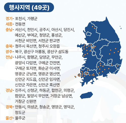 - 대상 지역: 경기, 세종, 충남, 전북, 전남, 경북, 경남, 울산 등 총 49곳의 특별재난지역 (*상세 지역은 공식 공지 참조)